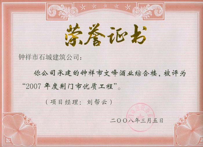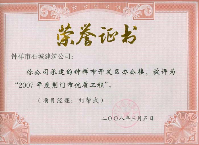 2008年3月被評為“2007年度荊門市優(yōu)質(zhì)工程”(鐘祥文峰就業(yè)綜合樓)