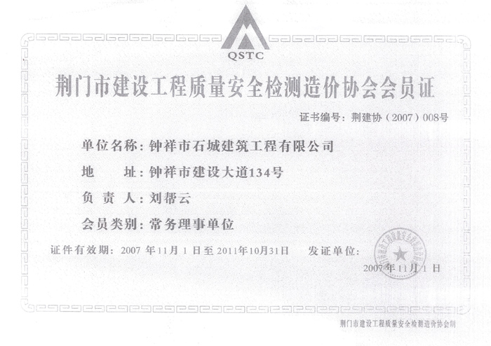 2007年11月荊門市建設(shè)工程質(zhì)量安全檢測(cè)造價(jià)協(xié)會(huì)會(huì)員證